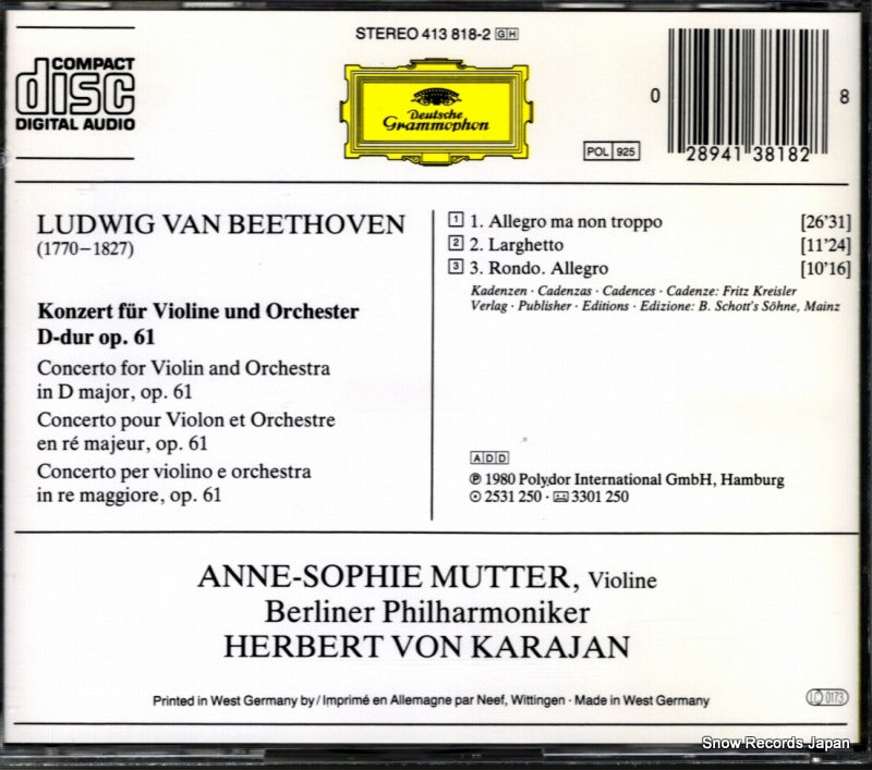 CD: KARAJAN, HERBERT VON / MUTTER, ANNE-SOPHIE - beethoven; concierto de violín - 413818-2